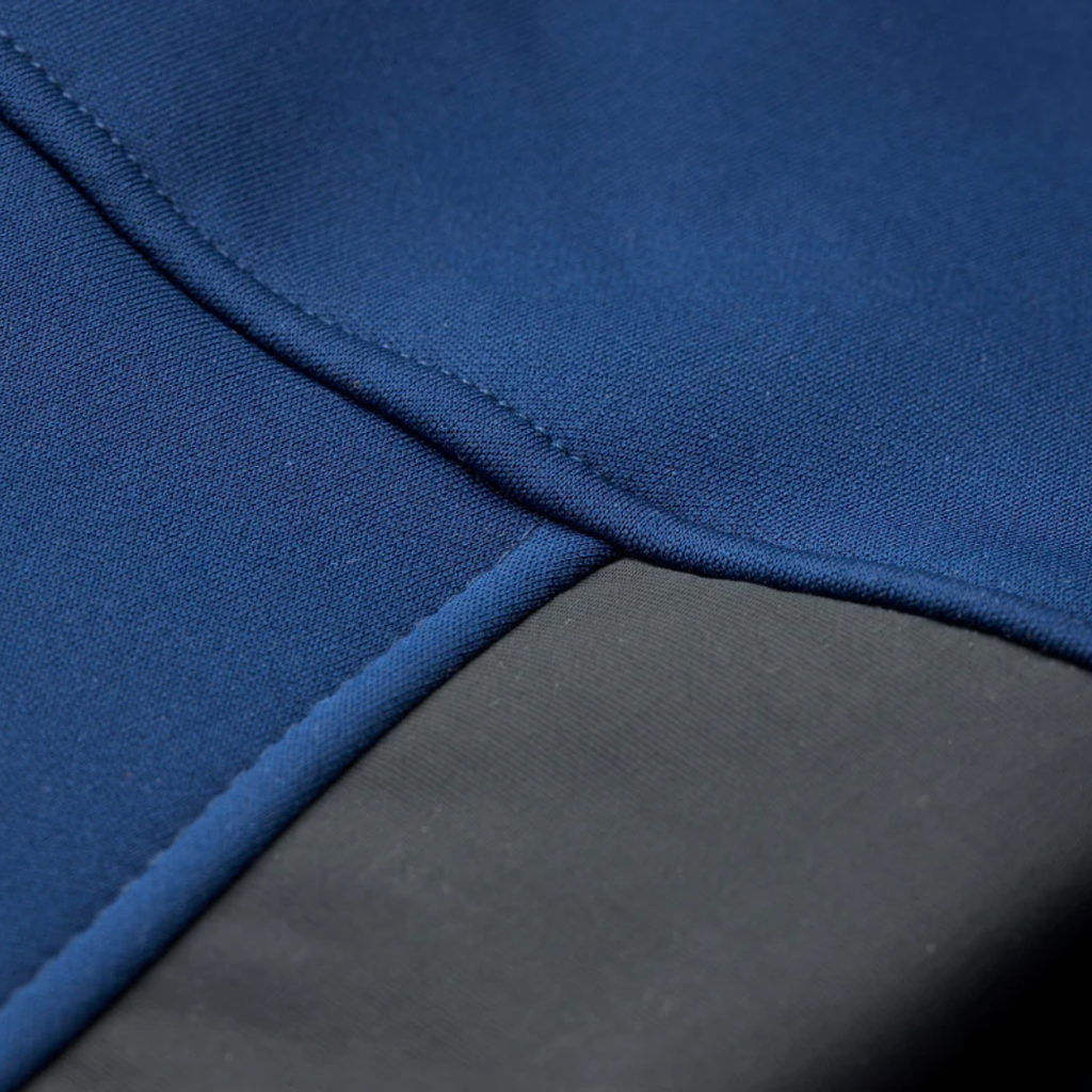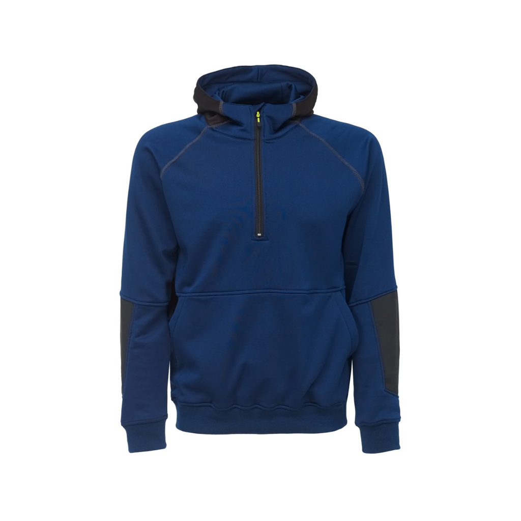 This super-comfortable hoodie, available in navy, and gray, features side pockets, elbow reinforcement, and contrast stitching. The fabric is 95% polyester and 5% elastane. It has a loose fit for comfort. The sleeves have a protective material applied, and there is a solid 1/4 zipper in the middle of the front. It also includes a kangaroo pocket and a collar protector. Reflective piping runs along the upper back, and there is ribbing at the hem loop and cuffs. Available in sizes S–3XL.